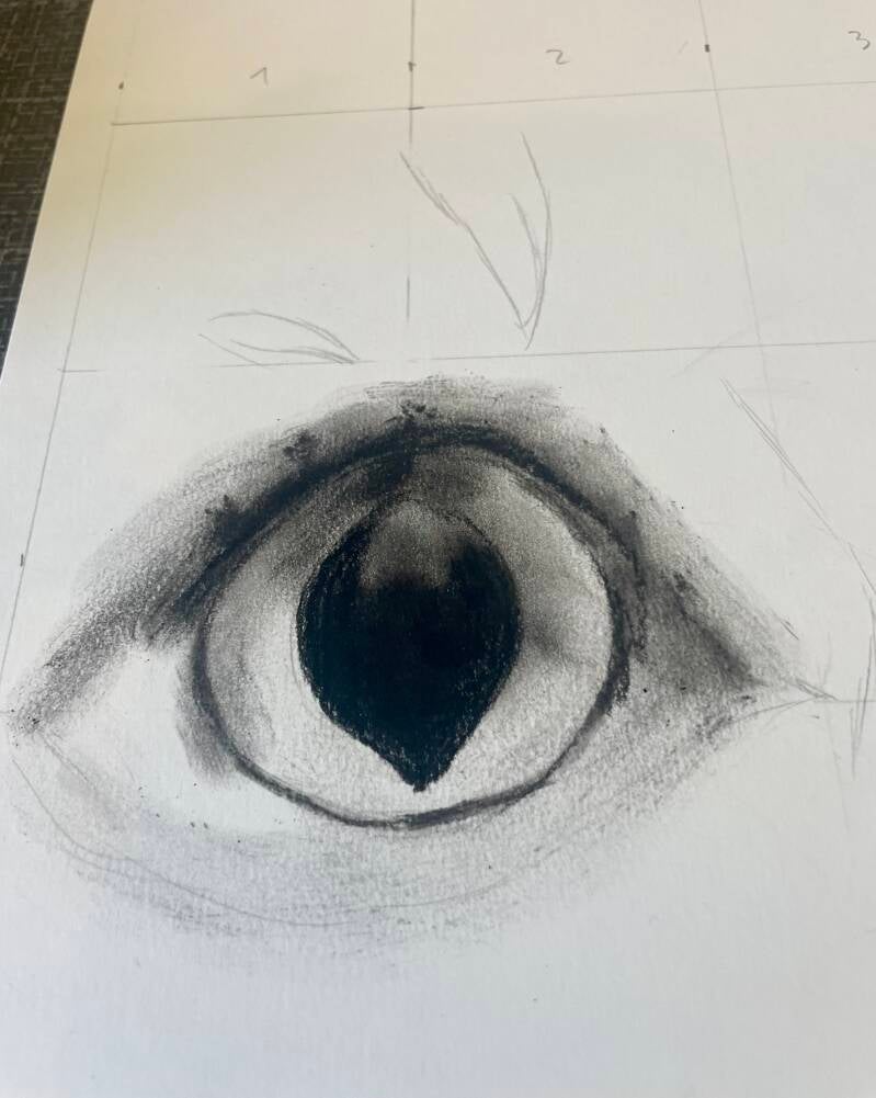 Etape 2 : J'ai redessiné le contour de l’orbite et de la pupille au crayon et ensuite commencé à appliquer à la poudre les zones d’ombre.